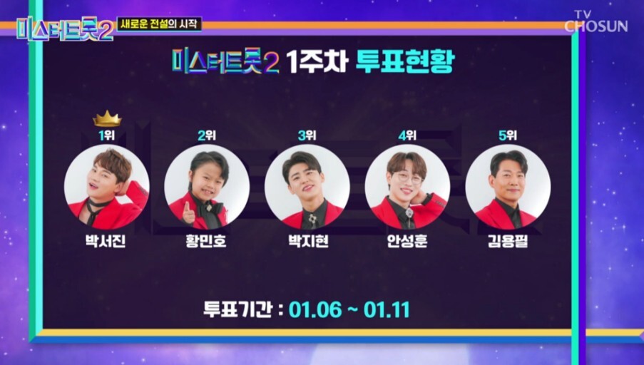 지난 6일에서 11일에 걸쳐 진행된 투표에서 1위 박서진, 2위 황민호, 3월 박지현, 4위 안성훈, 5위 김용필로 이미 팬덤을 많이 보유하고 있는 박서진 님이 1위를 차지했습니다.